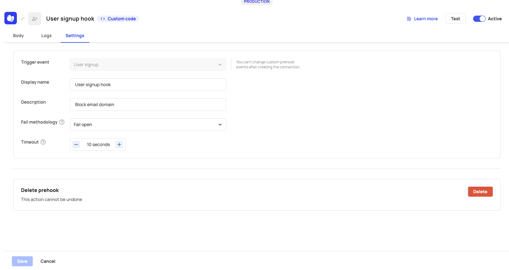 After testing and creating your prehook, you can view and adjust its settings. Each prehook has a Logs tab where you can see the triggered events associated with that prehook. Note that you can't change the Trigger event for custom prehooks after the connection is initiated.