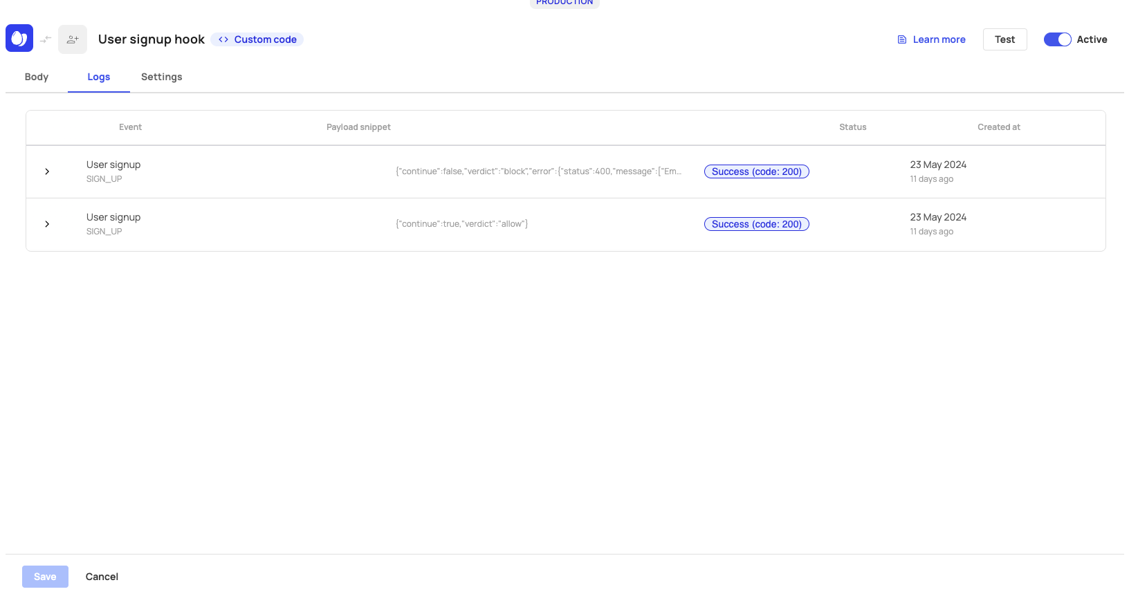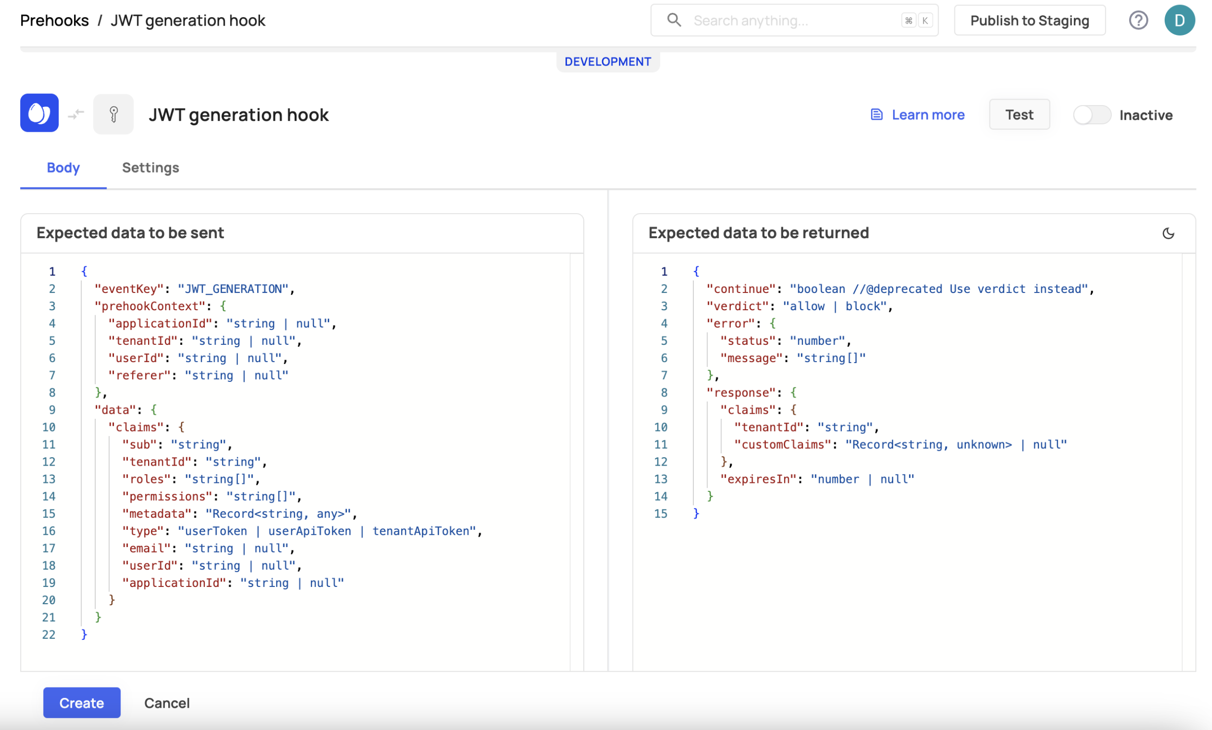 jwt.verify(<x-webhook-secret-value>, <the secret in the dashboard on hook settings>)To finalize your hook creation, test your prehook to verify everything was setup correctly.