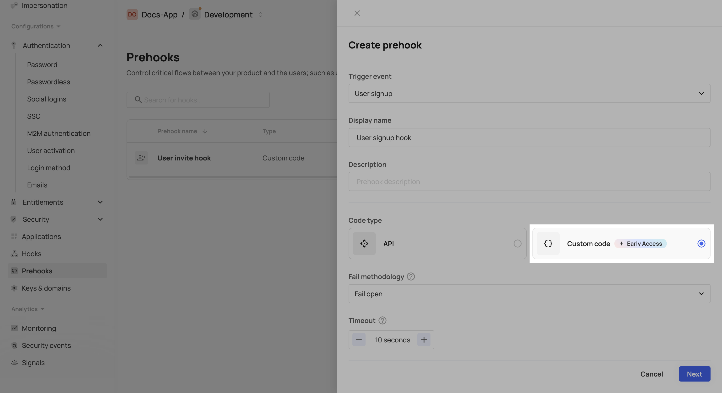 a. Go to the Prehooks tab, choose the Custom code option, and press Next.