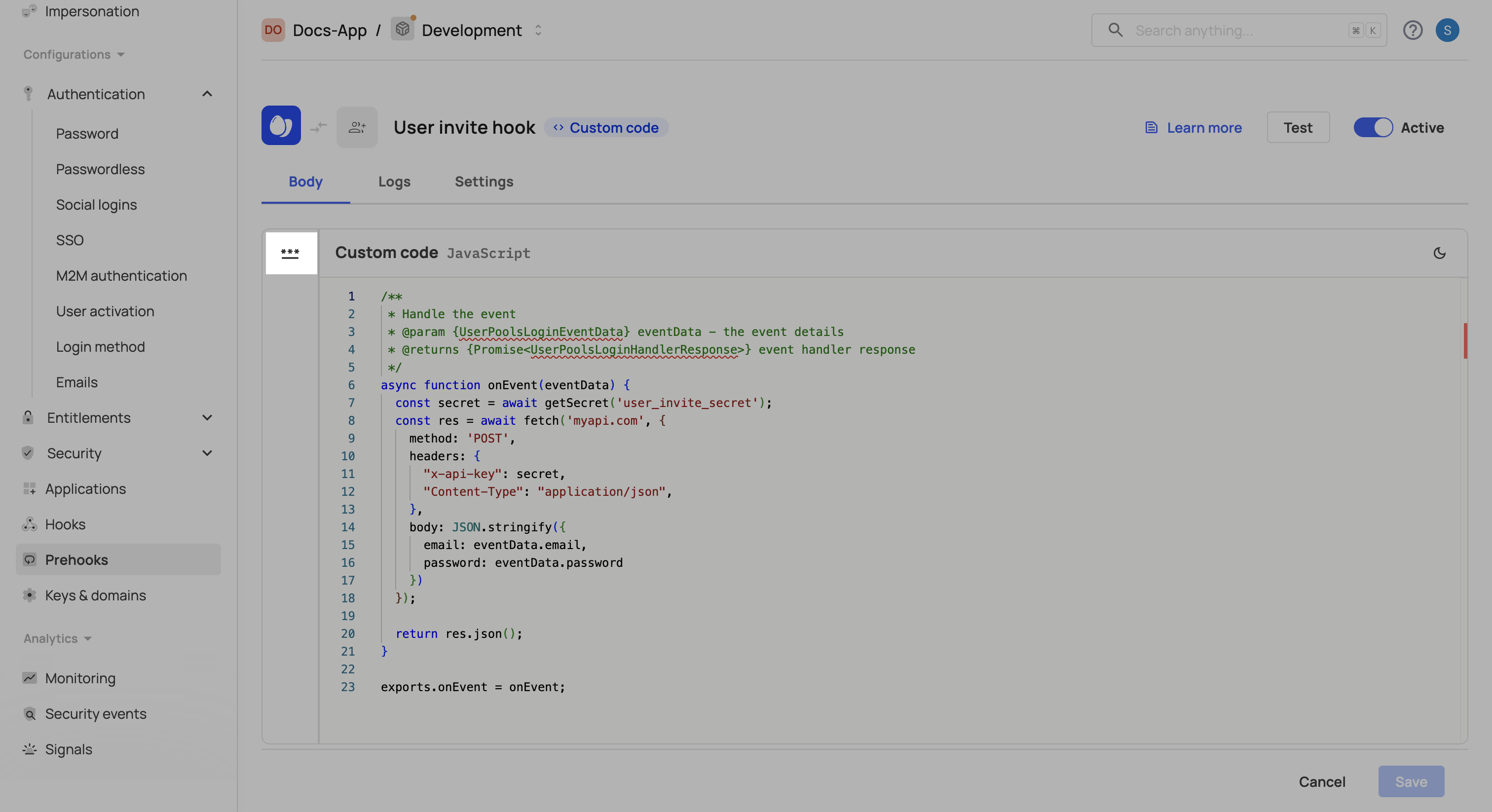 Go to the User Pools tab and either create a new external user pool or edit an existing one. Choose the custom code source code and press the three dots icon to open the secrets' drawer. Proceed with the steps outlined in Step 3: Create secret.