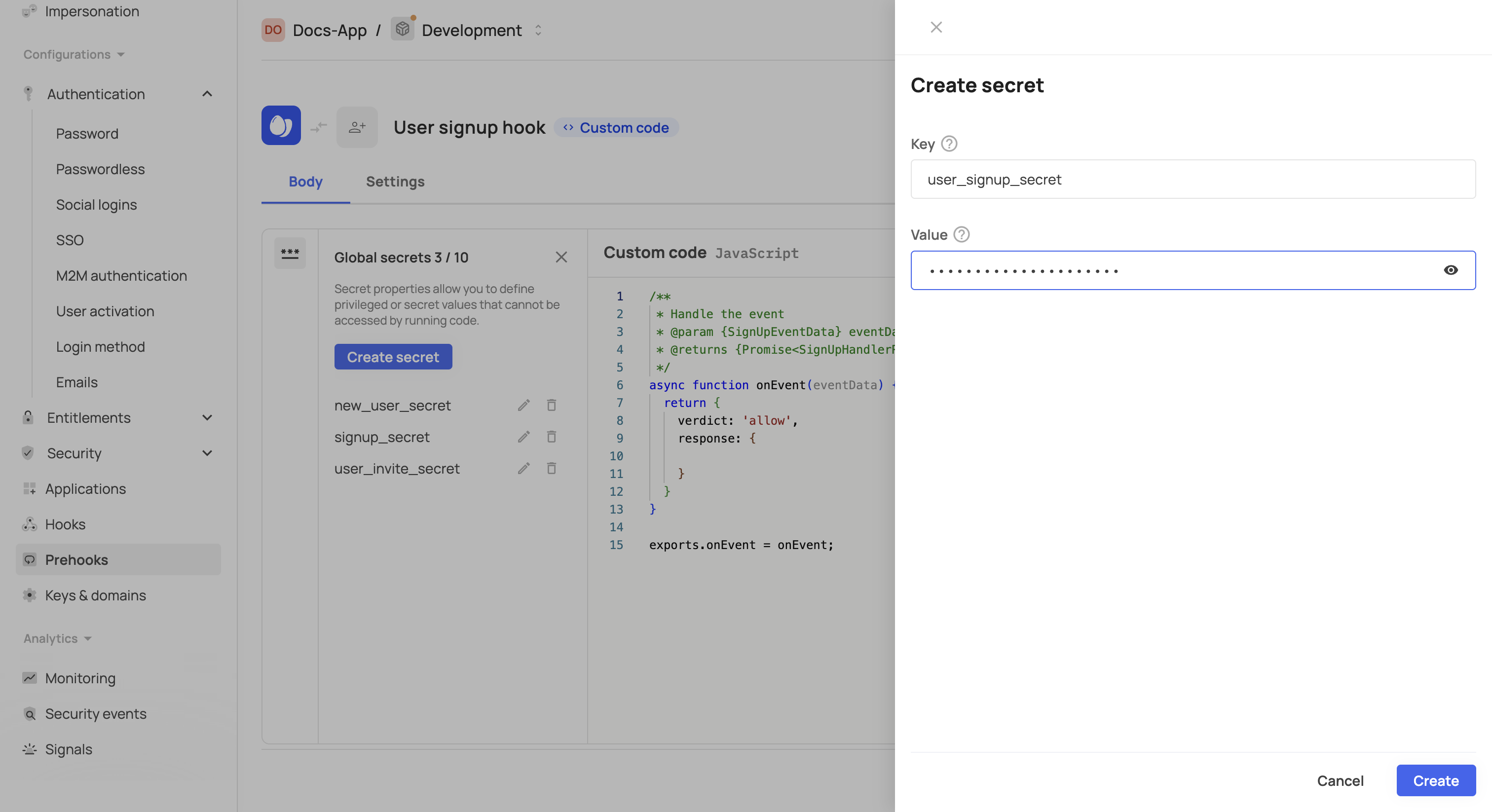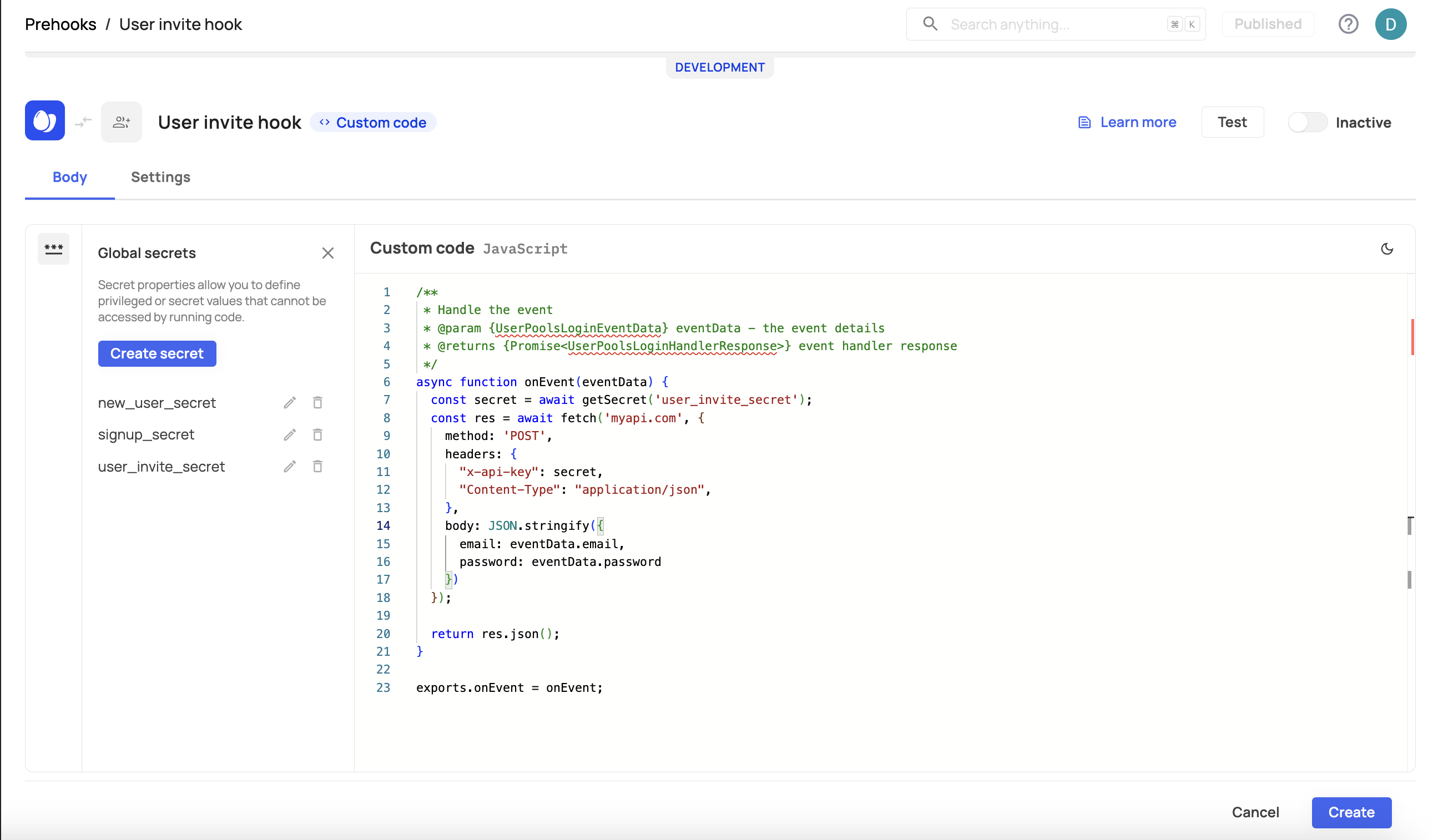 The creation of a new secret, whether for an external user pool or for custom code prehooks, is done via the three-dot icon in your custom code window.