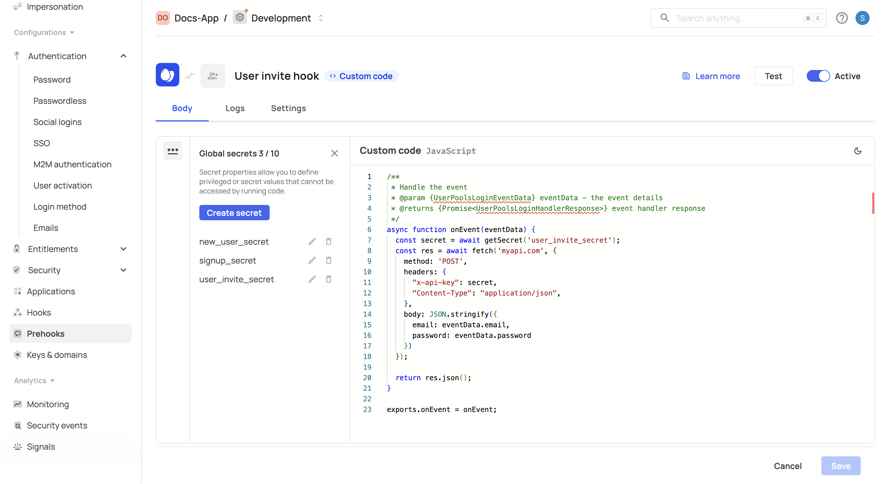 Frontegg supports secret management in custom code prehooks and in creating custom code (external) user pool configurations, including in your Flows or sub-flows. The use and creation of secrets allow you to encrypt your data while accessing third-party APIs in the safest way possible, without exposing sensitive information and compromising data security.
