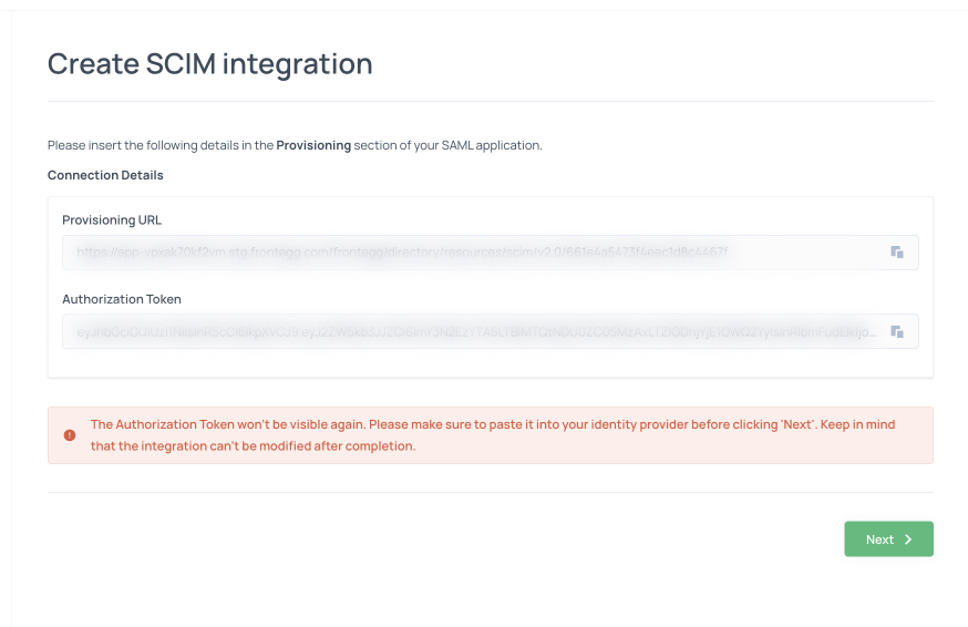 - Copy the Authorization token and the Provisioning URL into their Identity provider, SAML application, provisioning section: