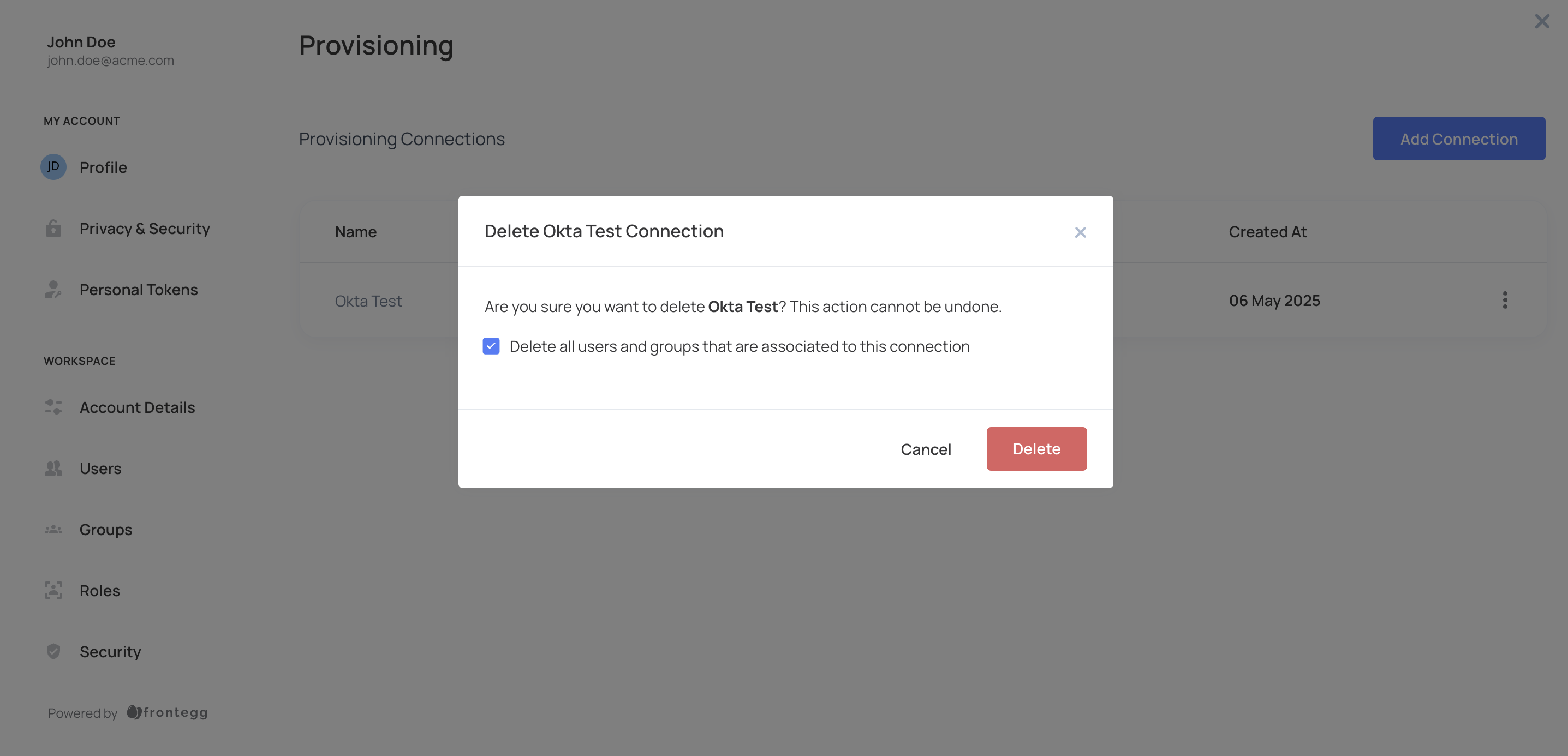 When deleting a SCIM connection from the self-service portal, the option to remove all associated users and groups is selected by default. If this option is unchecked, previously synced users and groups cannot be deleted through self-service. Managing externally provisioned users is a privileged action and can only be performed via the Frontegg management dashboard.