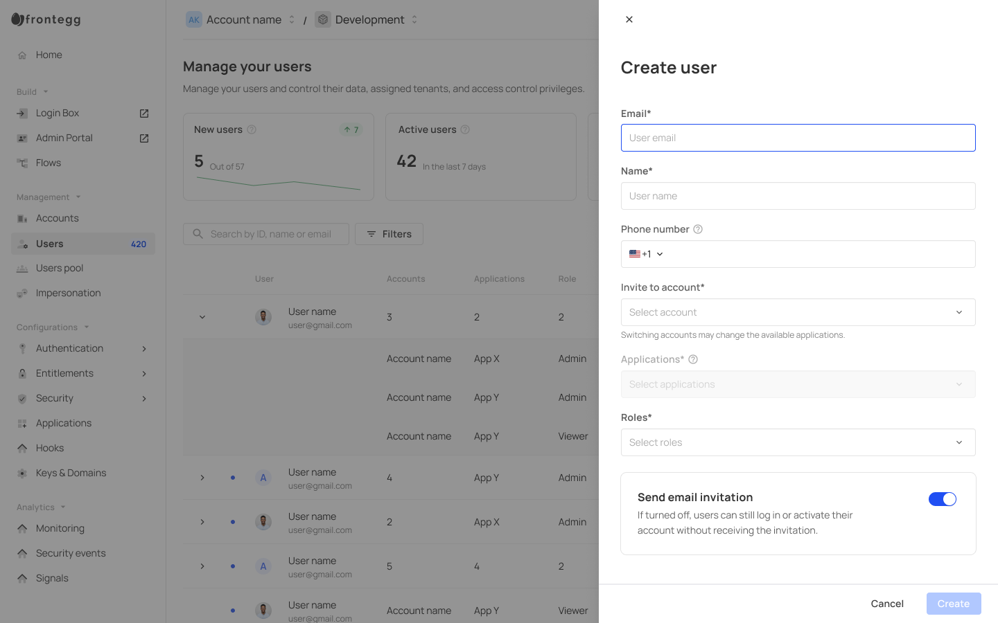 When inviting a user to an account on Frontegg, you can choose to add them silently by unchecking the Send an email invitation option. In this case, the user will be added without receiving an activation or invitation email and will have a Pending login status.