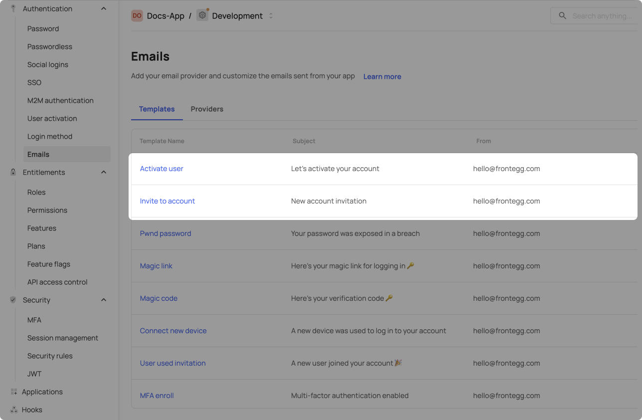 User activation and user invitation are common events in the authentication flow of new and existing users and a way to ensure they are authorized to access your app. Frontegg equips you with two popular methods to allow users to verify their identities in these instances — either via a magic link or with a 6-digit code (magic code).