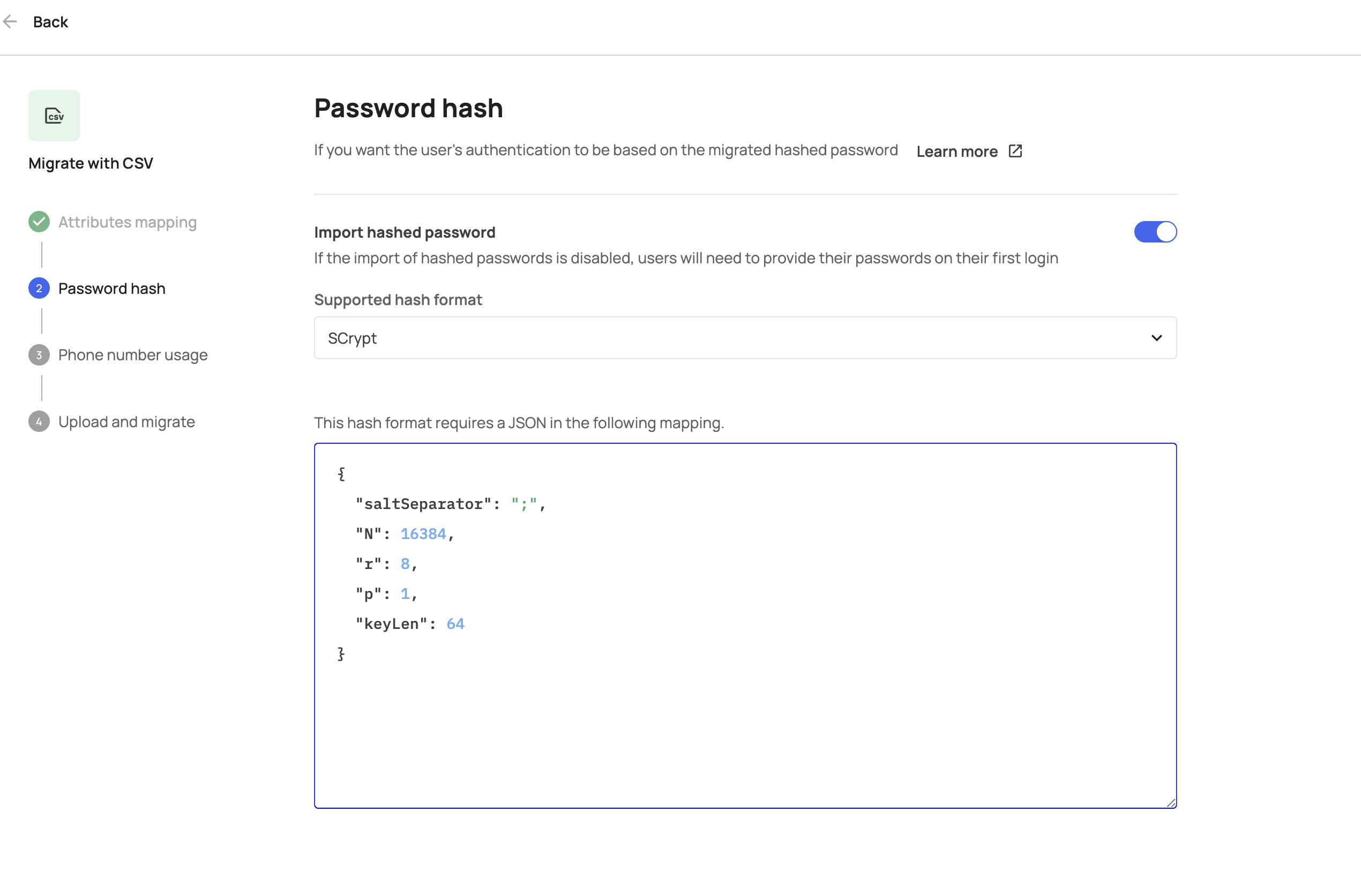 While not mandatory, if you opt to import users with their hash passwords, the format used should be supported by Frontegg. Choose the hash format from the dropdown menu in the second step of CSV migration (Select hash format) and follow the instructions to ensure proper migration.