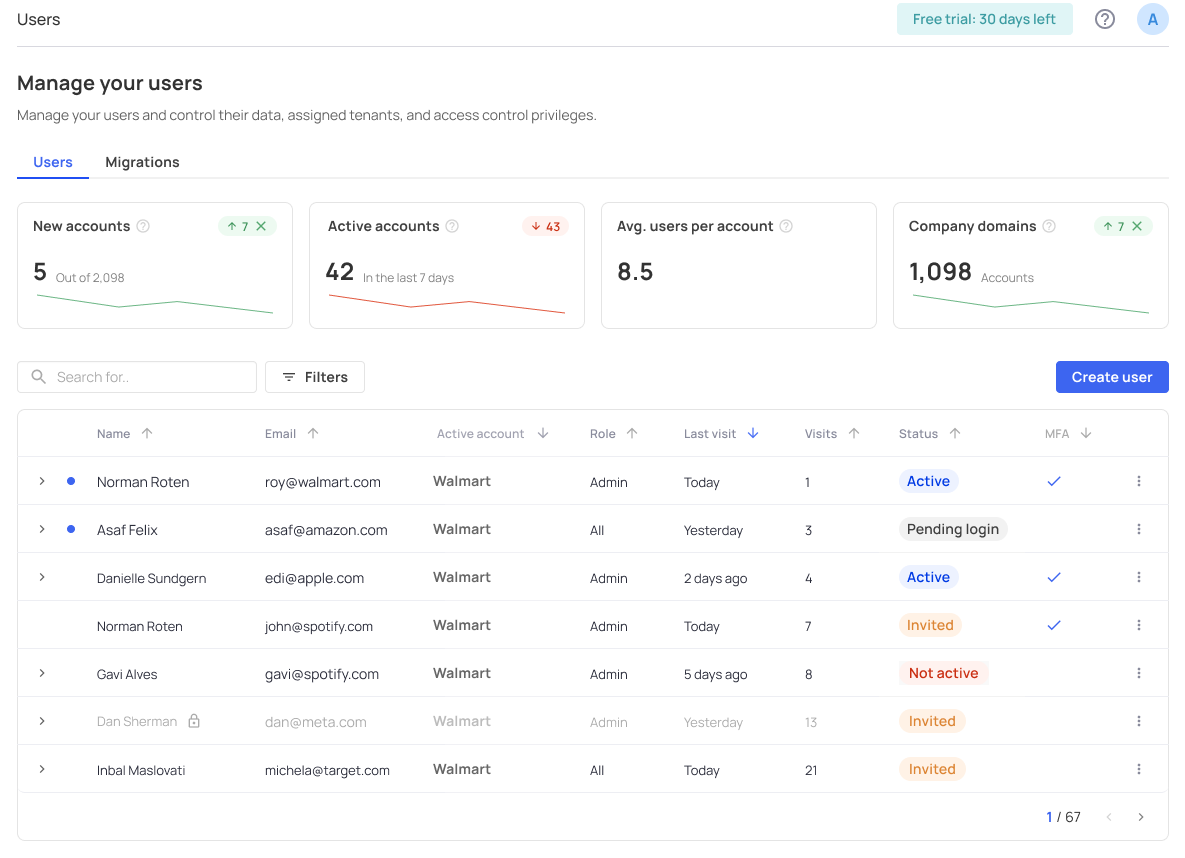 You can now perform the migration process efficiently from your Users page located in your Management menu, where you must upload a JSON file describing the correlation between the column name of the legacy system and Frontegg.