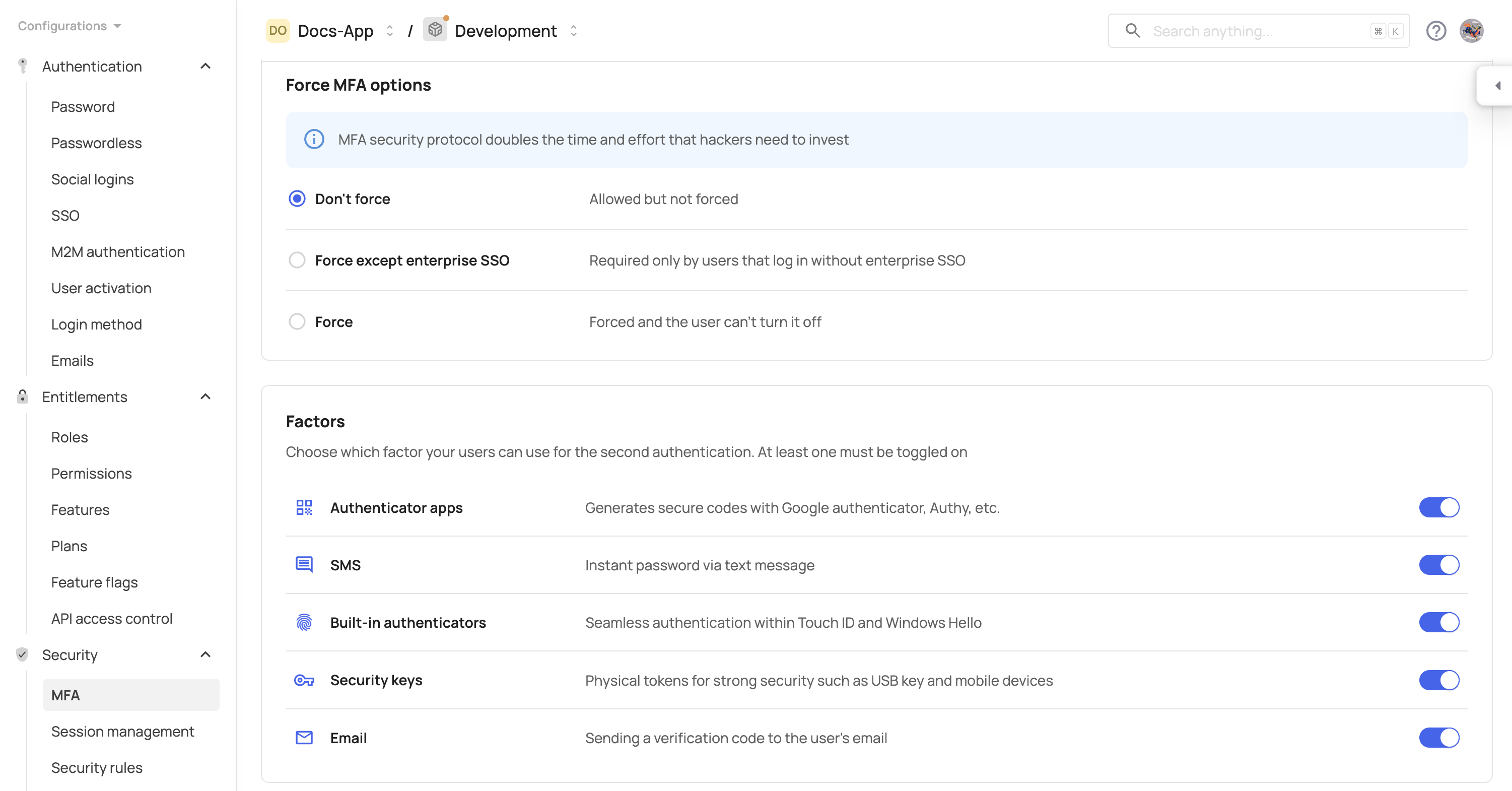 - Don’t force: MFA is optional. Users may choose to enable MFA in the self-service portal if this option is enabled.