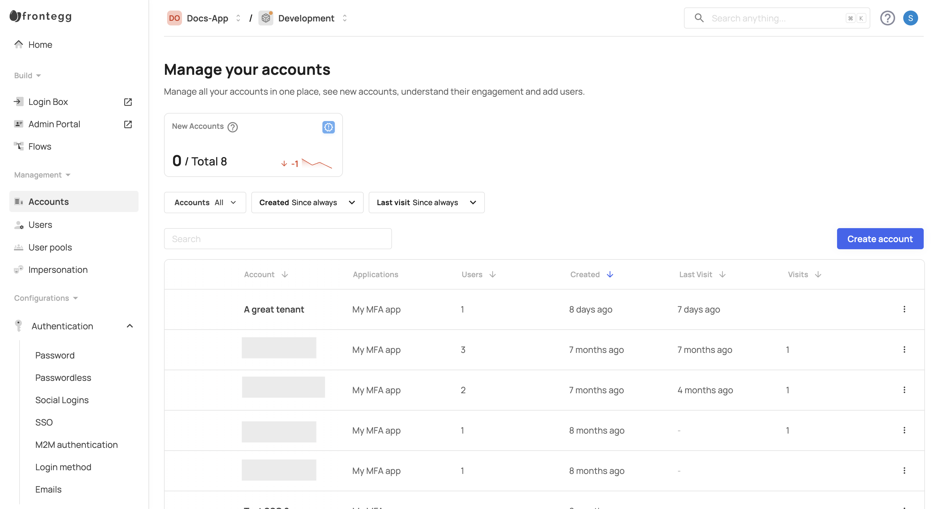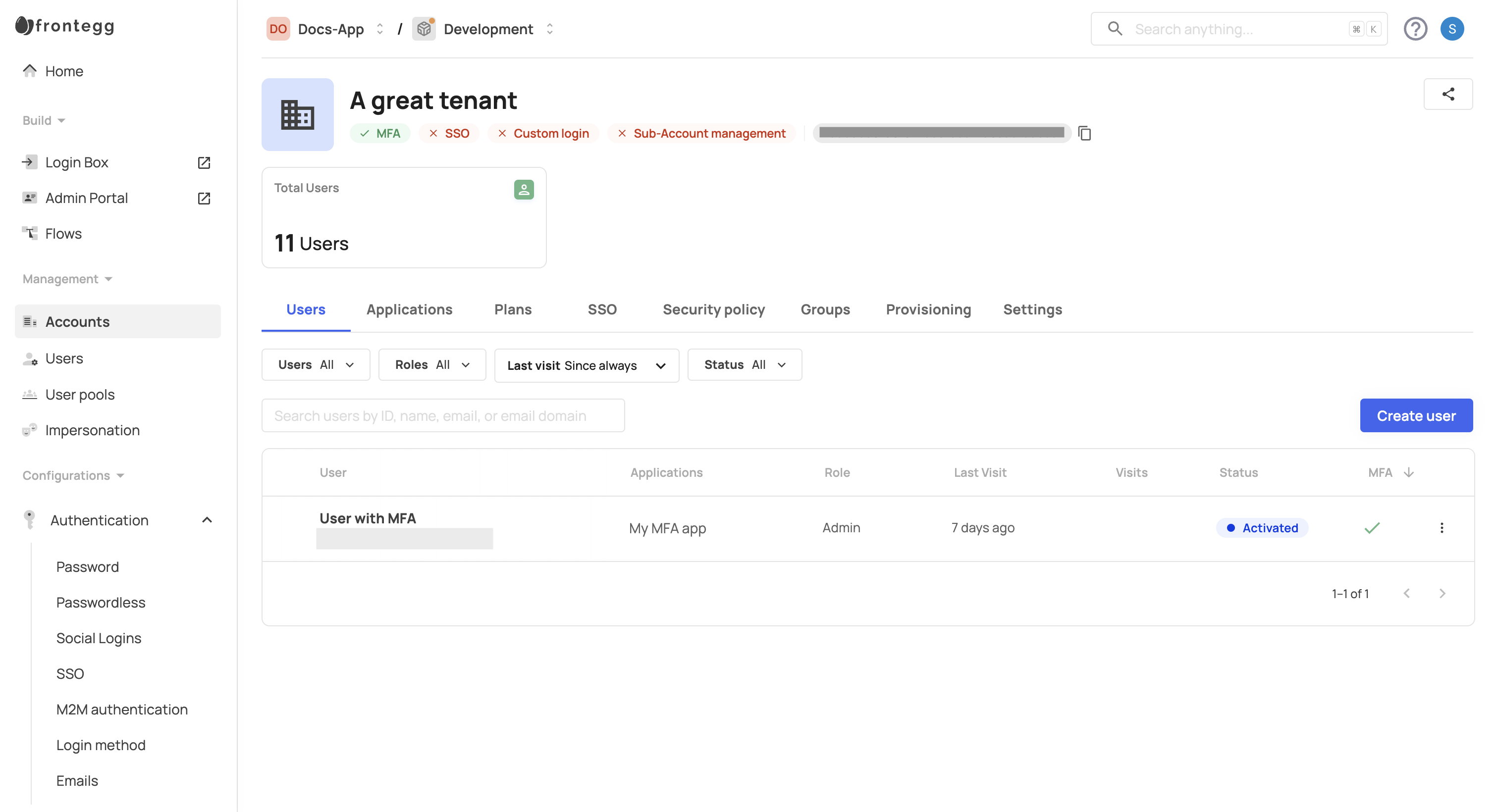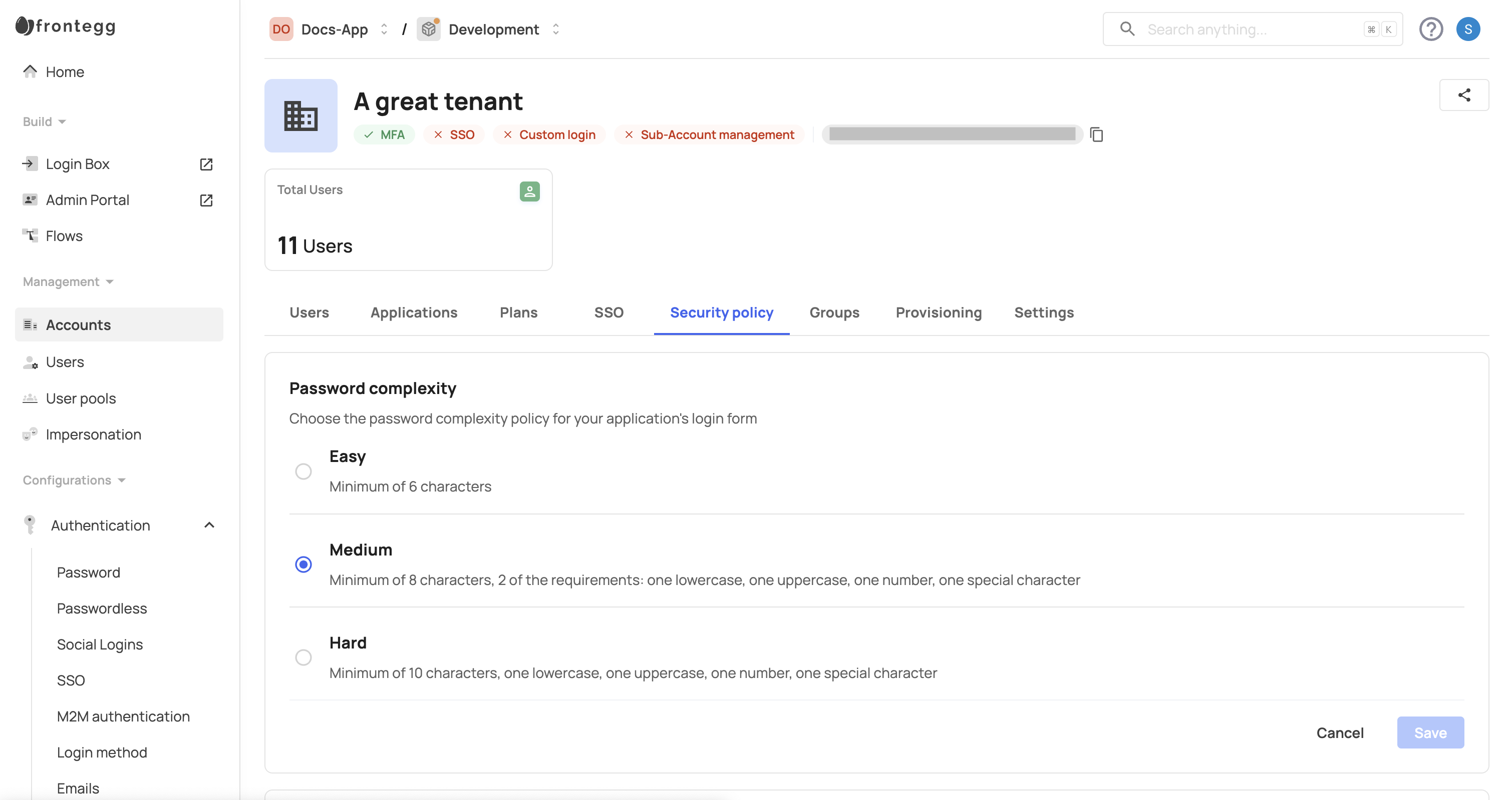 - Environment/account specificity: In addition to setting the default policy under Security ➜ MFA for each environment, you can customize MFA settings for individual accounts within any environment in the Frontegg portal. For more information, refer to the Managing Accounts guide.