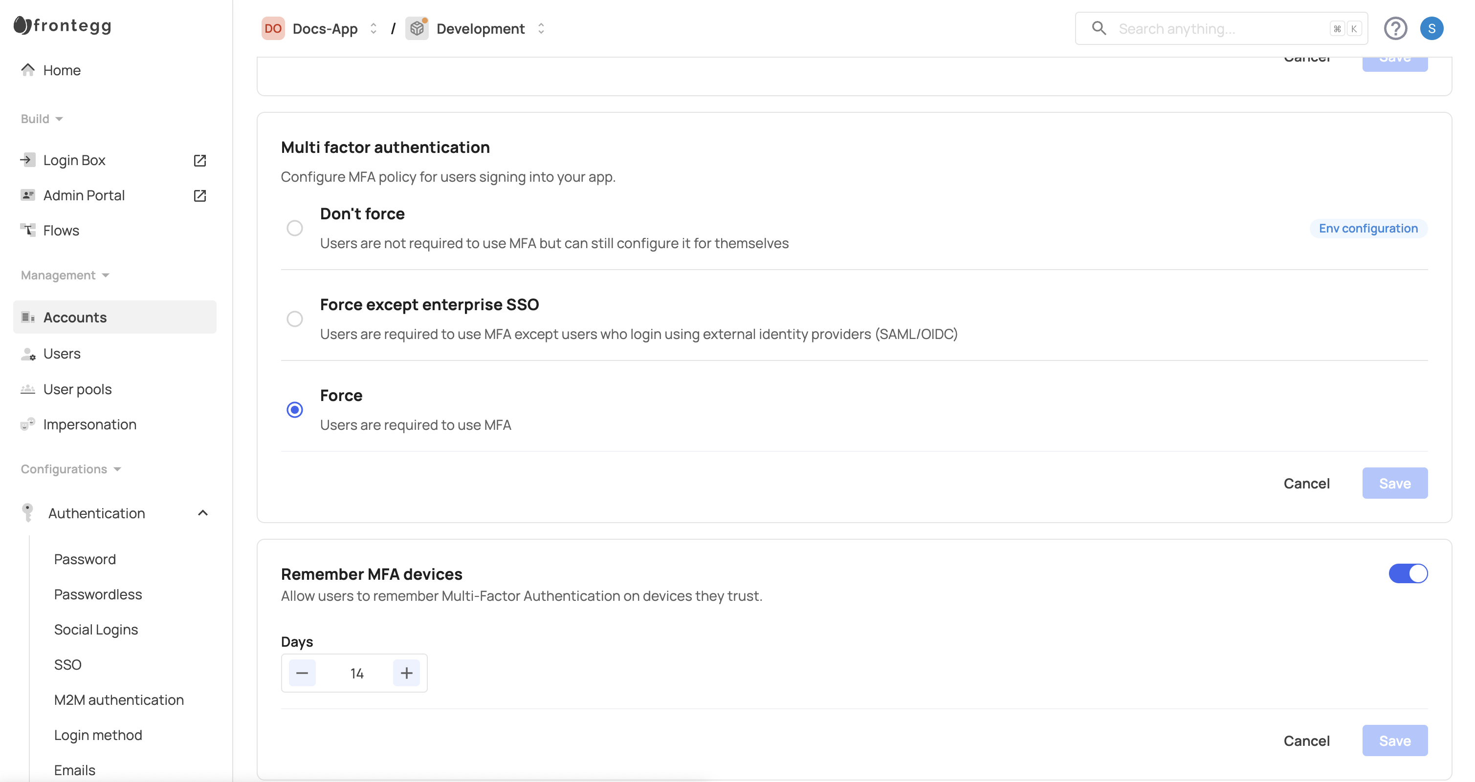 If a user belongs to multiple accounts and only one enforces MFA, the user will be required to use MFA across all accounts they belong to, as Frontegg applies the strictest rule per user.