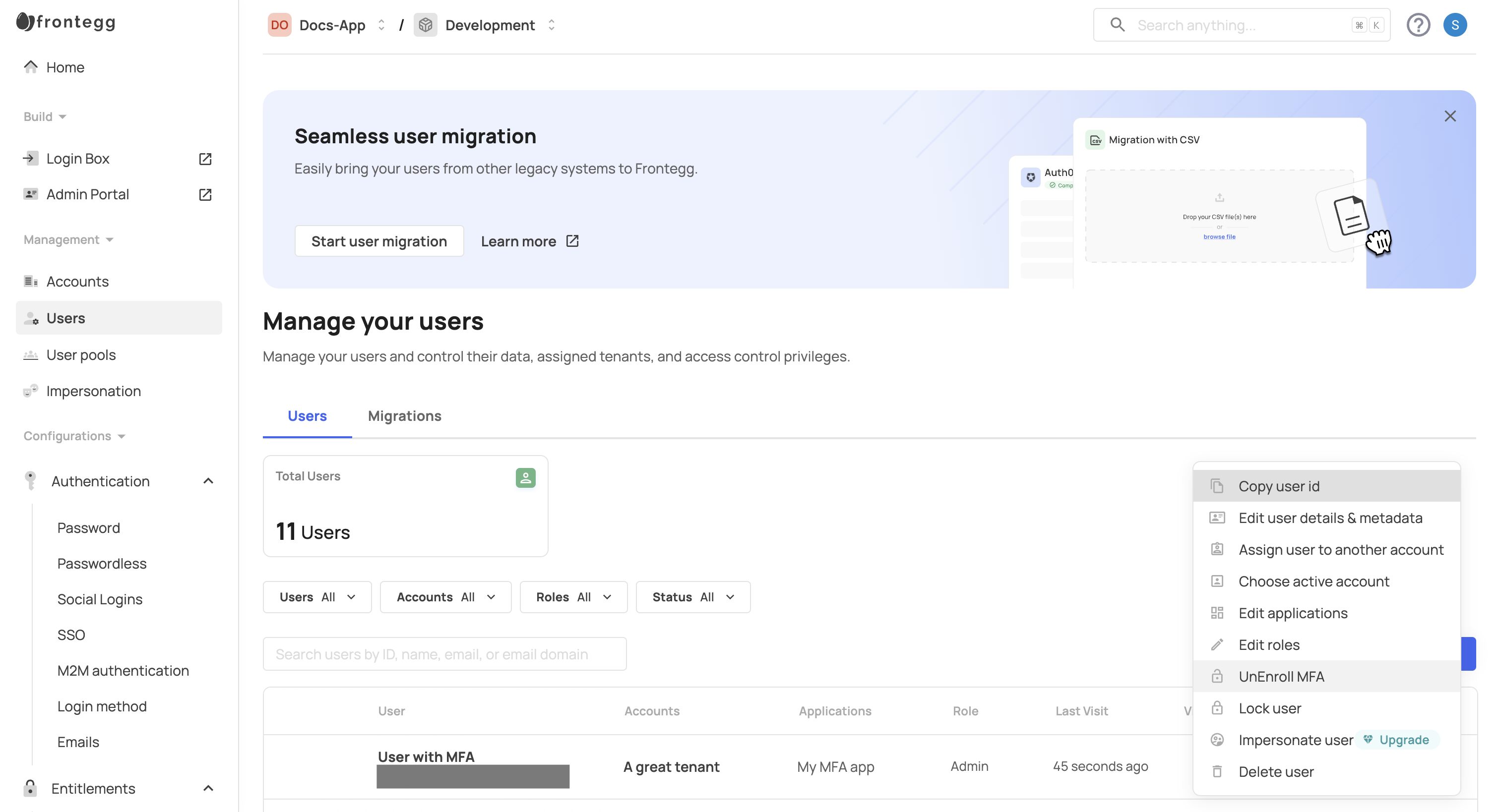 When users set up MFA, they receive a recovery code to temporarily bypass MFA if needed. If they forget the code or cannot pass MFA, you can unenroll them from MFA in the [ENVIRONMENT] → Management → Users tab in the Frontegg portal.