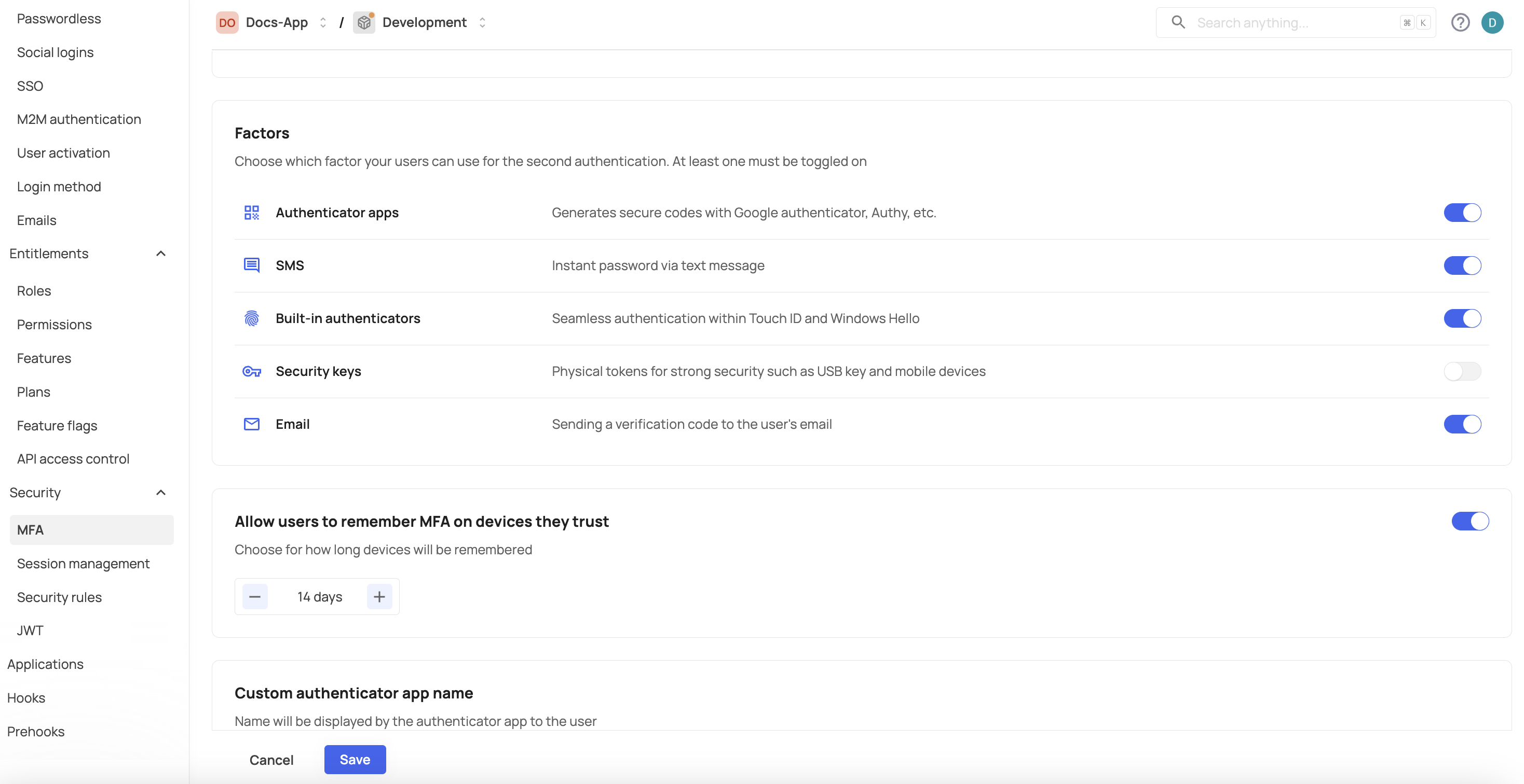 - Enable the desired MFA methods for users: Authenticator Apps, SMS, Security Keys (WebAuthn), Built-in Authenticators (WebAuthn) and then click Save.