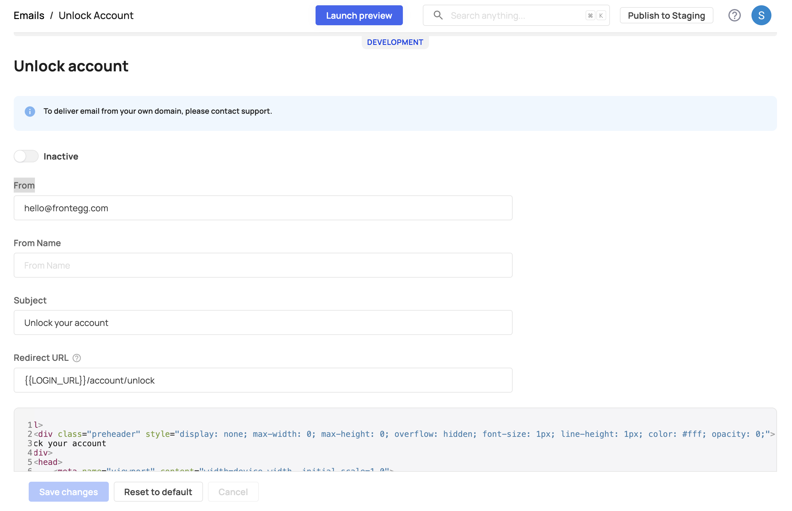 Once the Send unlock account email toggle is enabled, ensure that the Unlock account email template is also enabled. Go to [ENVIRONMENT] → Configurations → Authentication → Emails to activate it. You may also enable the Unlock account success email to inform users once their account has been successfully unlocked.
