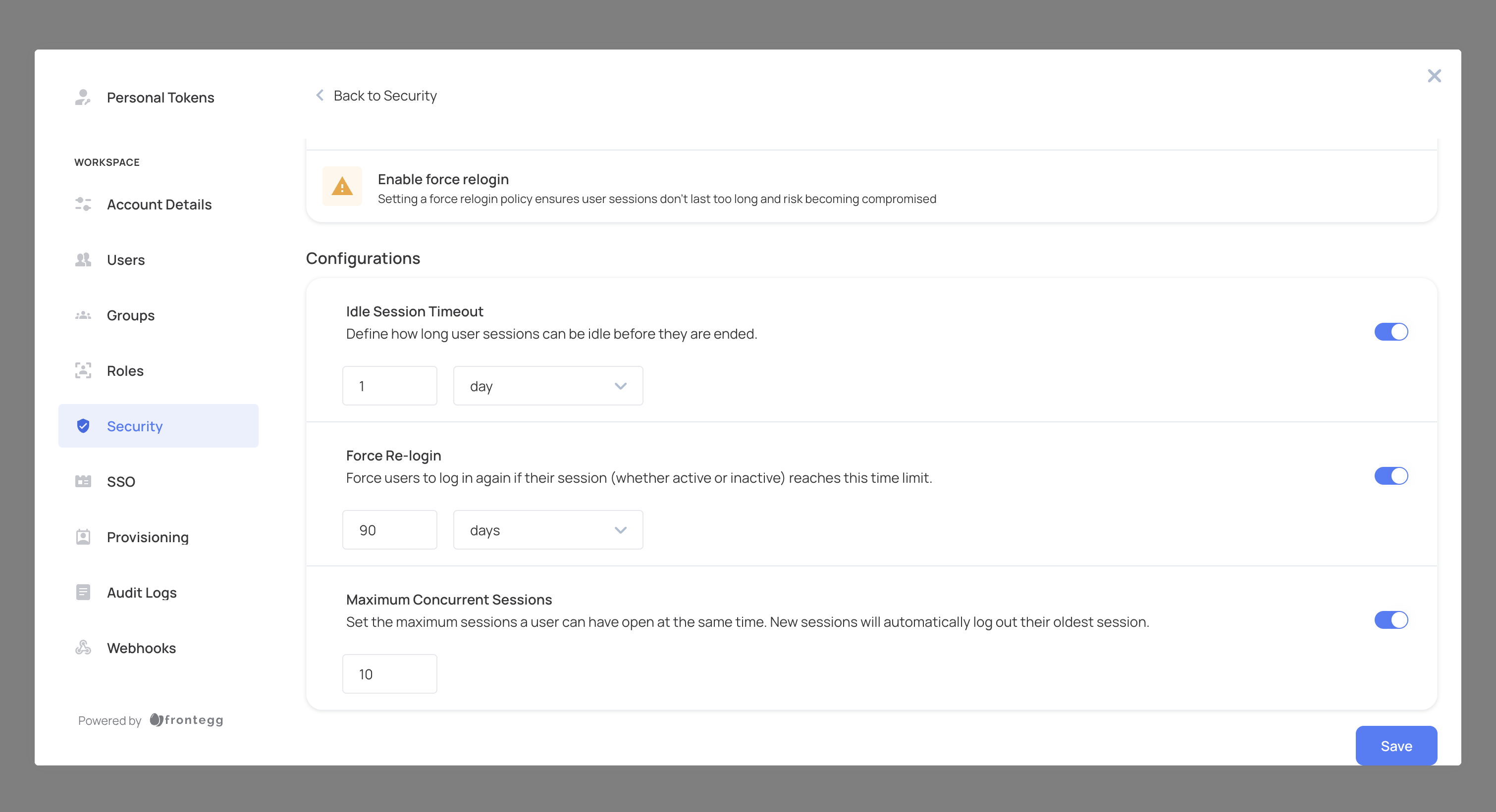 This feature sets the maximum duration for a session. After this time limit is reached, the user will be logged out regardless of activity.- To configure: Toggle the Force Re-login switch to enable the feature, and set the desired duration in days, hours, or minutes. We recommend setting it to a value under 90 days.
