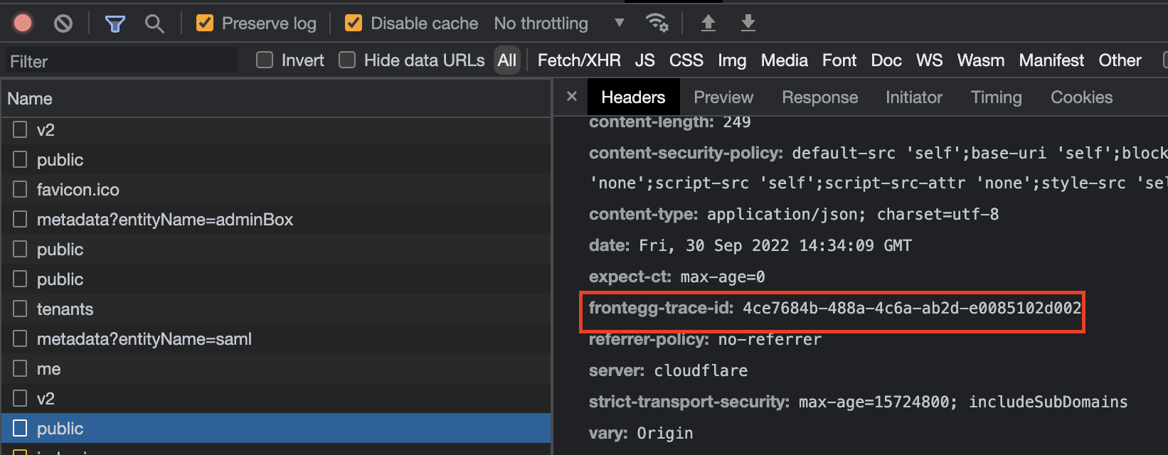 Each request that is being sent to Frontegg will have a frontegg-trace-id in the Response headers of the request.