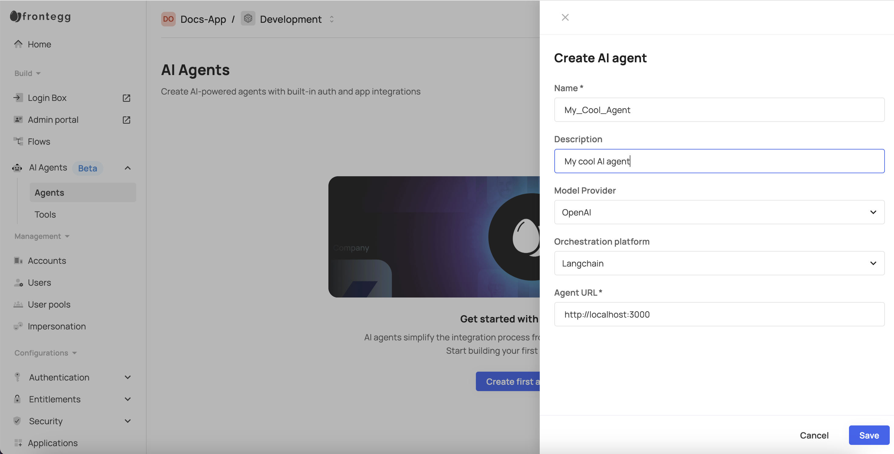 This guide walks you through building a functional AI agent application using the Frontegg AI SDK, inspired by the Frontegg AI Agent example reference project.